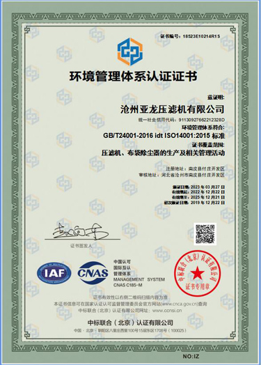 環境管理體系認證證書-滄州亞龍壓濾機有限公司