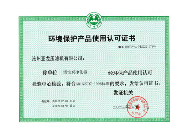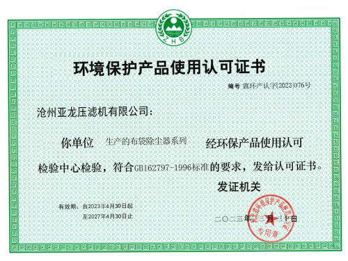 環境保護產品使用認可證書-滄州亞龍壓濾機有限公司